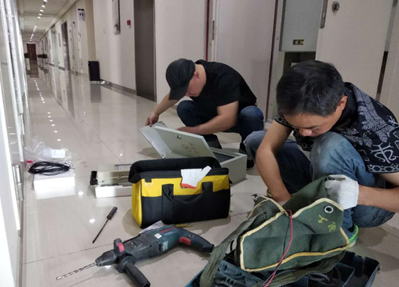 接到此項(xiàng)任務(wù)后,公司董事長(zhǎng)王立剛立即安排邵世禮、張海清兩位技術(shù)骨干前往現(xiàn)場(chǎng)施工。5月14日,兩位同志不顧疲勞,放棄自己的休息時(shí)間,趕往琥珀五環(huán)城辦公場(chǎng)所的施工現(xiàn)場(chǎng),立刻進(jìn)行緊張而有序的工作。在既不能拉閘停電影響辦公,又要注意安全規(guī)范操作的前提下,他們克服操作難度大、質(zhì)量要求高、時(shí)間緊迫等困難,經(jīng)過勘察、丈量、選材、采購(gòu)、鉆墻、打眼、安裝等一系列工作,保質(zhì)保量的完成了線路安裝改造任務(wù),有效保障了國(guó)正公司后續(xù)招租工作的順利進(jìn)行。