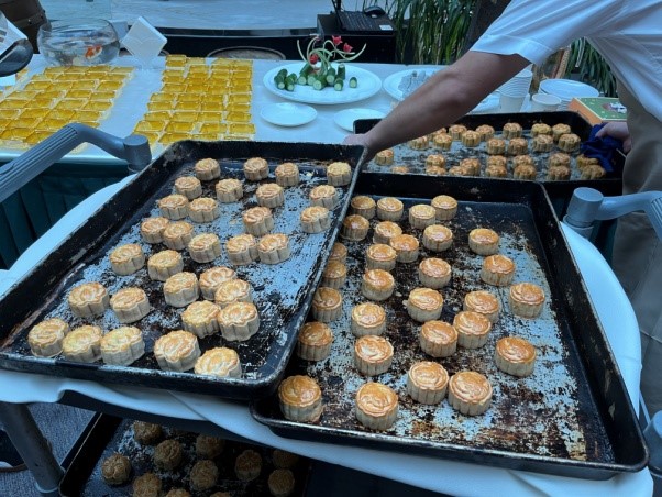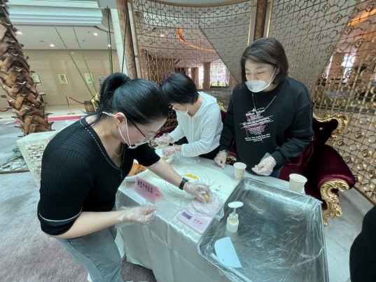 活動現(xiàn)場布置溫馨,茶歇臺上咖啡、月餅、水果等美食供大家休閑品嘗。面對豐富多樣的月餅食材和制作工具,大家躍躍欲試,4-5人為一組,在面點老師的指導下,動手揉餅皮、加餡料、包月餅、放入模具按壓成型,一邊探討著月餅的制作方法,一邊互相傳遞鮮花、玉兔、祥云等形狀的月餅模具。